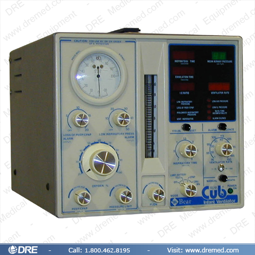 The Bear Cub infant respiratory ventilator provides time cycled, pressure limited operation with CPAP, CMV, and IMV modes. The Bear Cub is calibrated for a selection of ventilator rate from 1 - 150 BPM and inspiratory time from 0.1 - 3.0 seconds. The Cub has a digital display and both audible and visual alarms. Optional accessories: humidifier, pedestal stand, patient circuit, etc. DRE offers the Bear Cub ventilators refurbished.