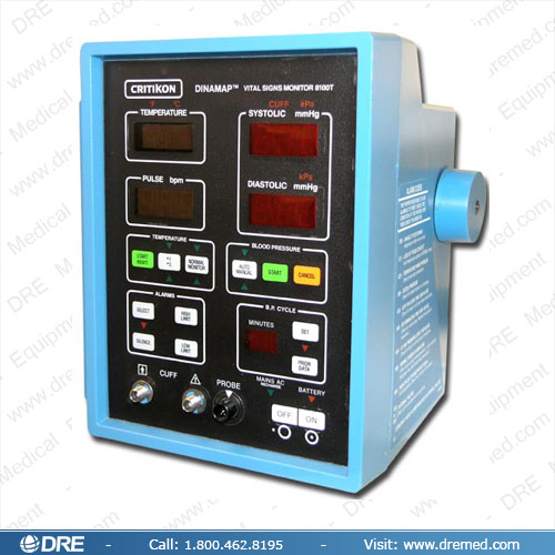 The Critikon Dinamap 8100 Adult/pediatric non-invasive blood pressure monitor measures systolic, mean, and diastolic pressures at preset levels, as well as pulse rate. Alarm and visual signals indicate when pressure goes outside preset limits. Various cuff sizes are available. DRE offers the Dinamap 8100 NIBP monitor refurbished.