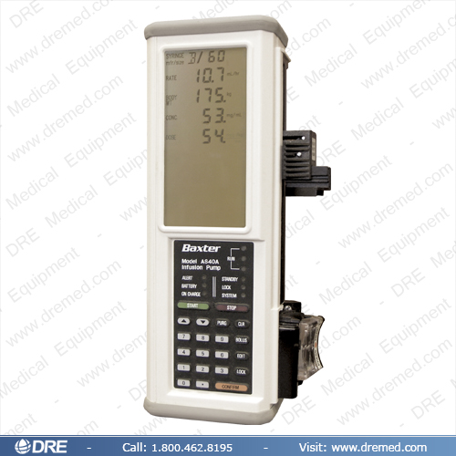 The Baxter AS40A Infusion Pump is designed to meet the fluid and drug delivery requirements of today's changing clinical environment. It provides for accurate continuous or intermittent infusion via intravenous (IV), intra-arterial (IA), epidural, or subcutaneous routes of administration.