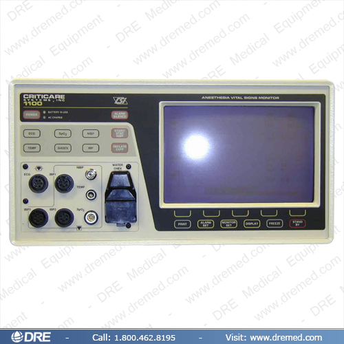 El Criticare 1100 monitor paciente mide ECG, el NIBP, SAO2, la respiración, la tensión arterial de temperaturas, invasiva, y el agente. La pantalla plasma muestra la forma de onda digital y la tendencia. El Criticare 1100 está disponible restaurado de DRE.